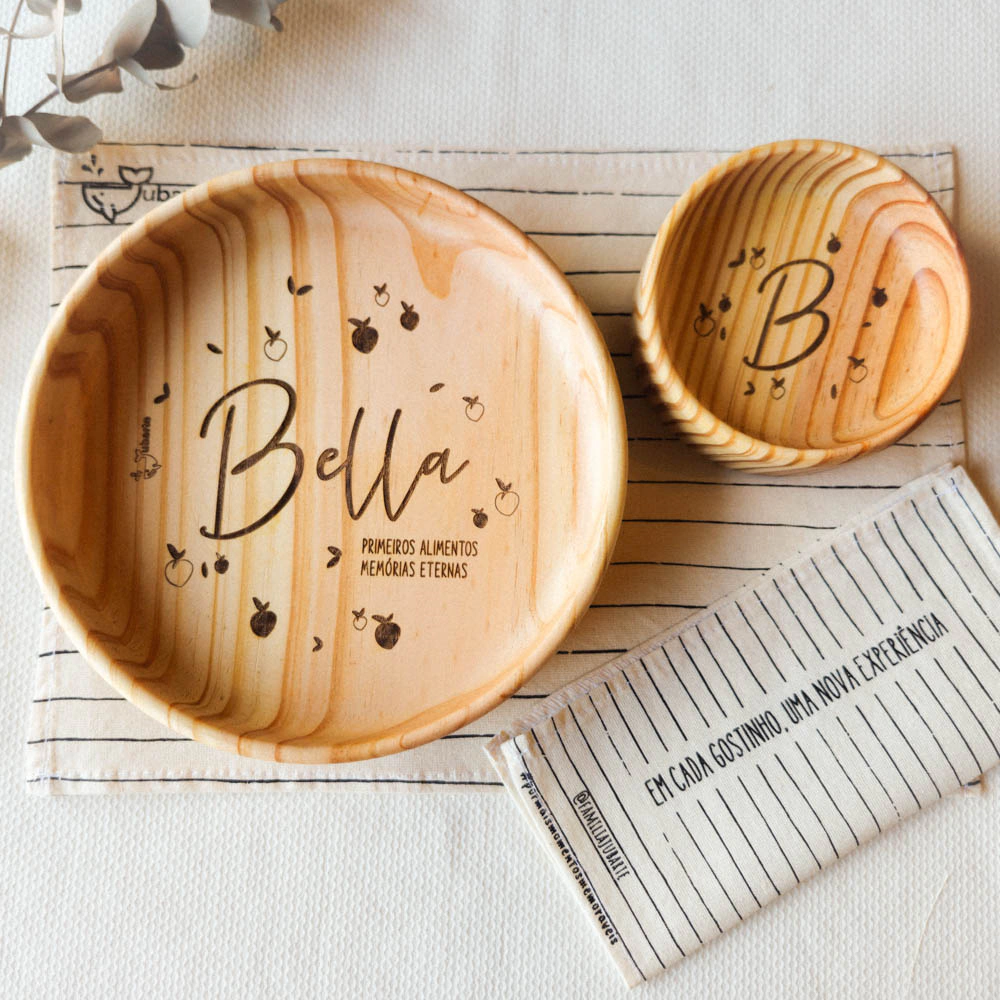 Nosso prato principal, com 20cm de diâmetro, é mais do que um utensílio; é uma cápsula do tempo. Personalize-o com o nome do seu pequeno, a frase "Primeiros alimentos, memórias eternas" e uma das três opções de arte exclusivas, criando assim, um cenário único para cada nova experiência gastronômica.