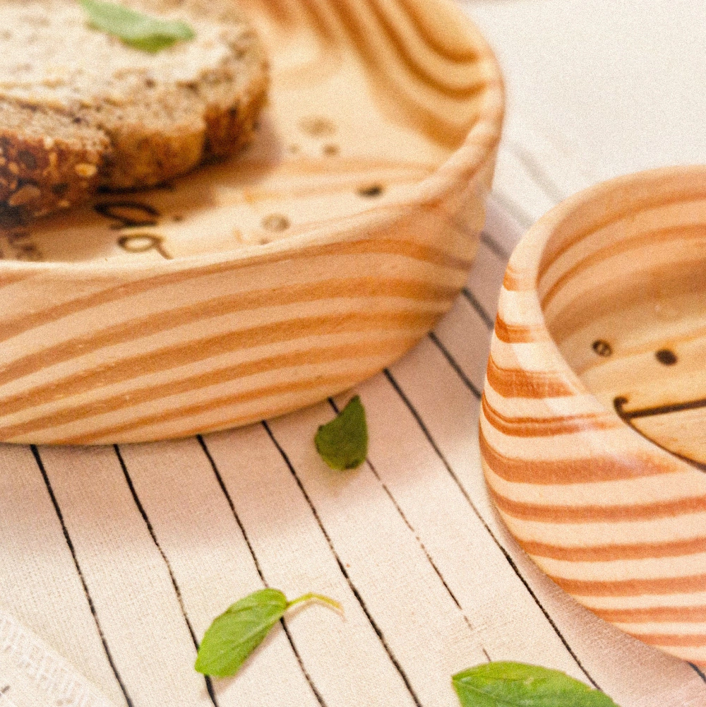 Feito de madeira de pinus selecionada, cada peça é finamente torneada à mão, garantindo uma exclusividade em casa peça. O acabamento com óleo 100% mineral, não-tóxico e seguro para alimentos, realça a beleza natural da madeira e garante facilidade de limpeza e durabilidade.