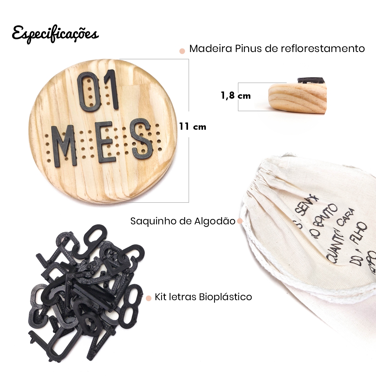 Personalização: Inclui duas unidades de cada número (0 a 9) e letras para formar palavras como "oi mundo", "dias", "sem.", "mês", "meses" e "anos". O nome do bebê pode ser personalizado, no entanto, a fonte e os temas são fixos e não podem ser alterados.